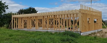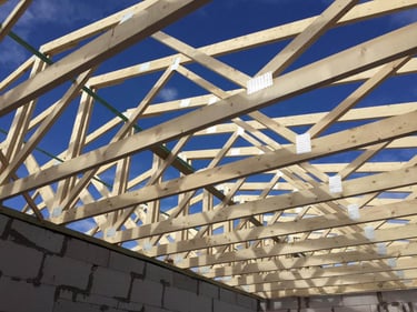 The load-bearing wooden structures of a building, most commonly used as columns, struts, beams, or rafters.